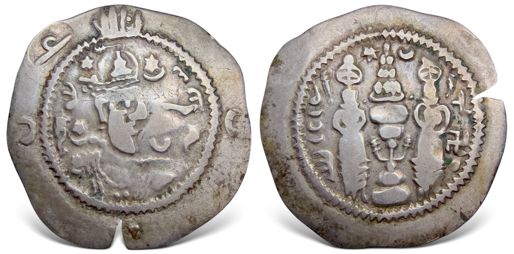 Imitating Khusru I of Sasanian kings, countermark at 11o'clock / Fire altar flanked by attendants, swastika replacing mint name to right.