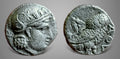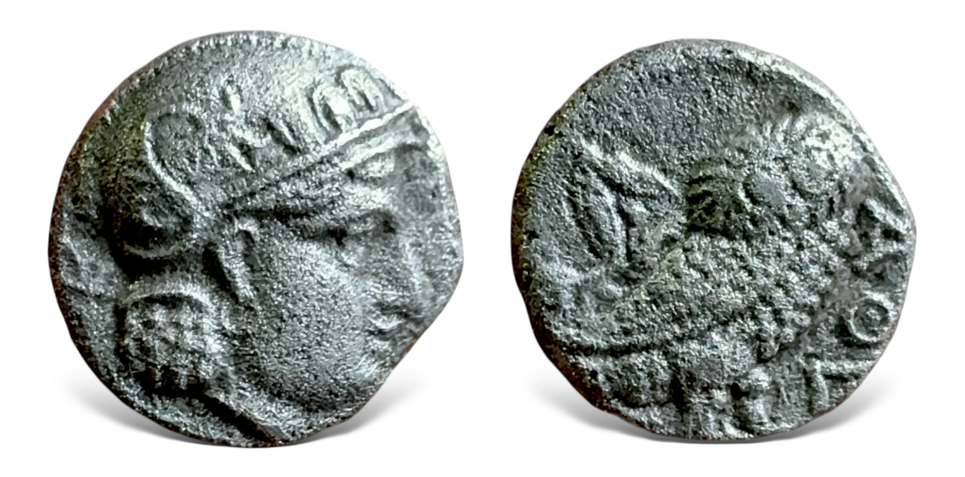 Helmeted head of Athena right, uncertain monogram to left / Owl standing right, head facing; olive sprig and crescent behind; grape bunch above tail.