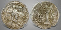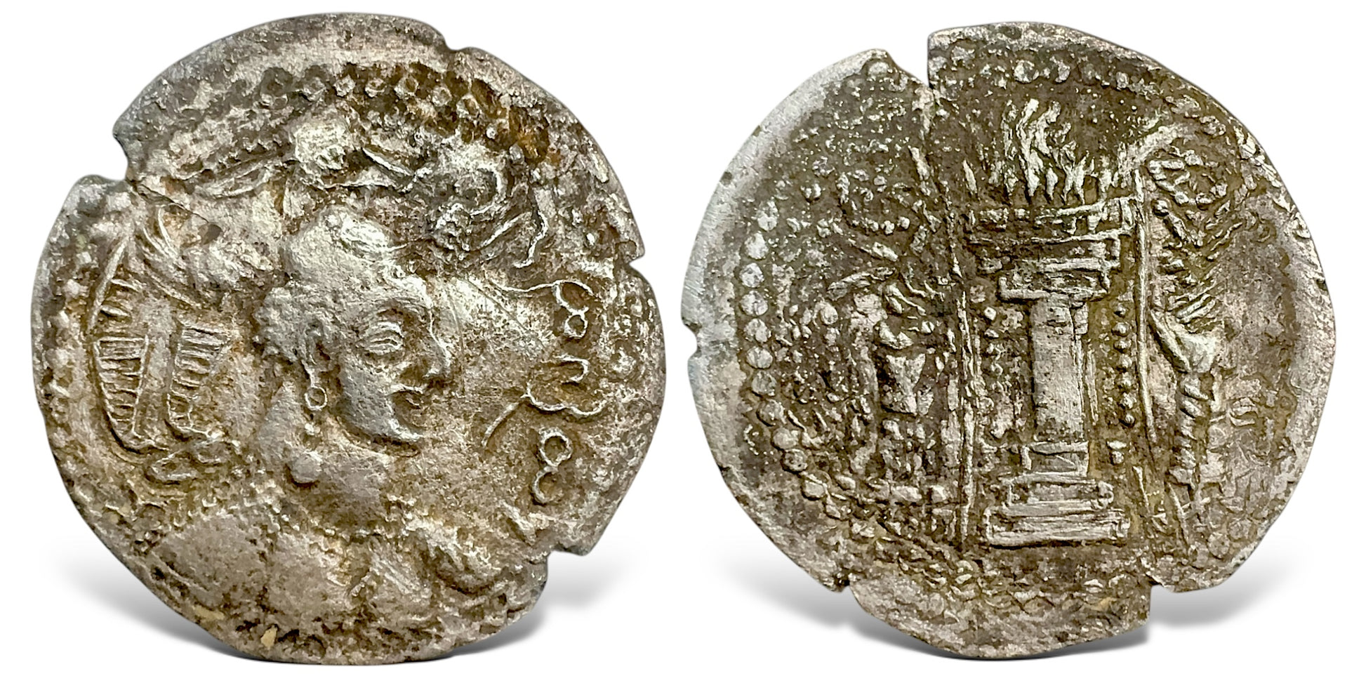 Crowned bust right / Fire altar with ribbons and attendants, solar wheels above attendants.