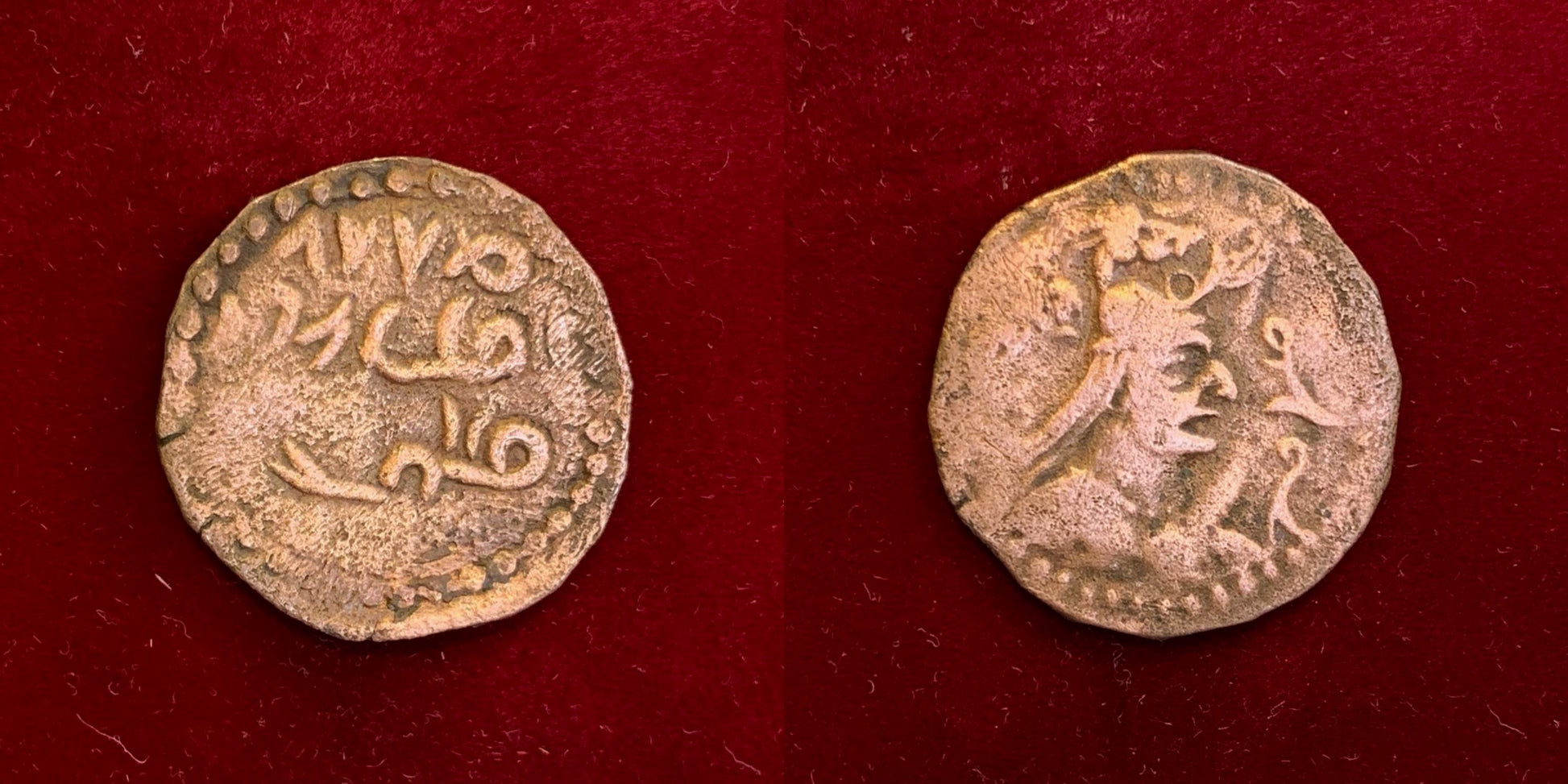 Crowned bust right tamgha to right / Three uncertain lines of writing (very clear).