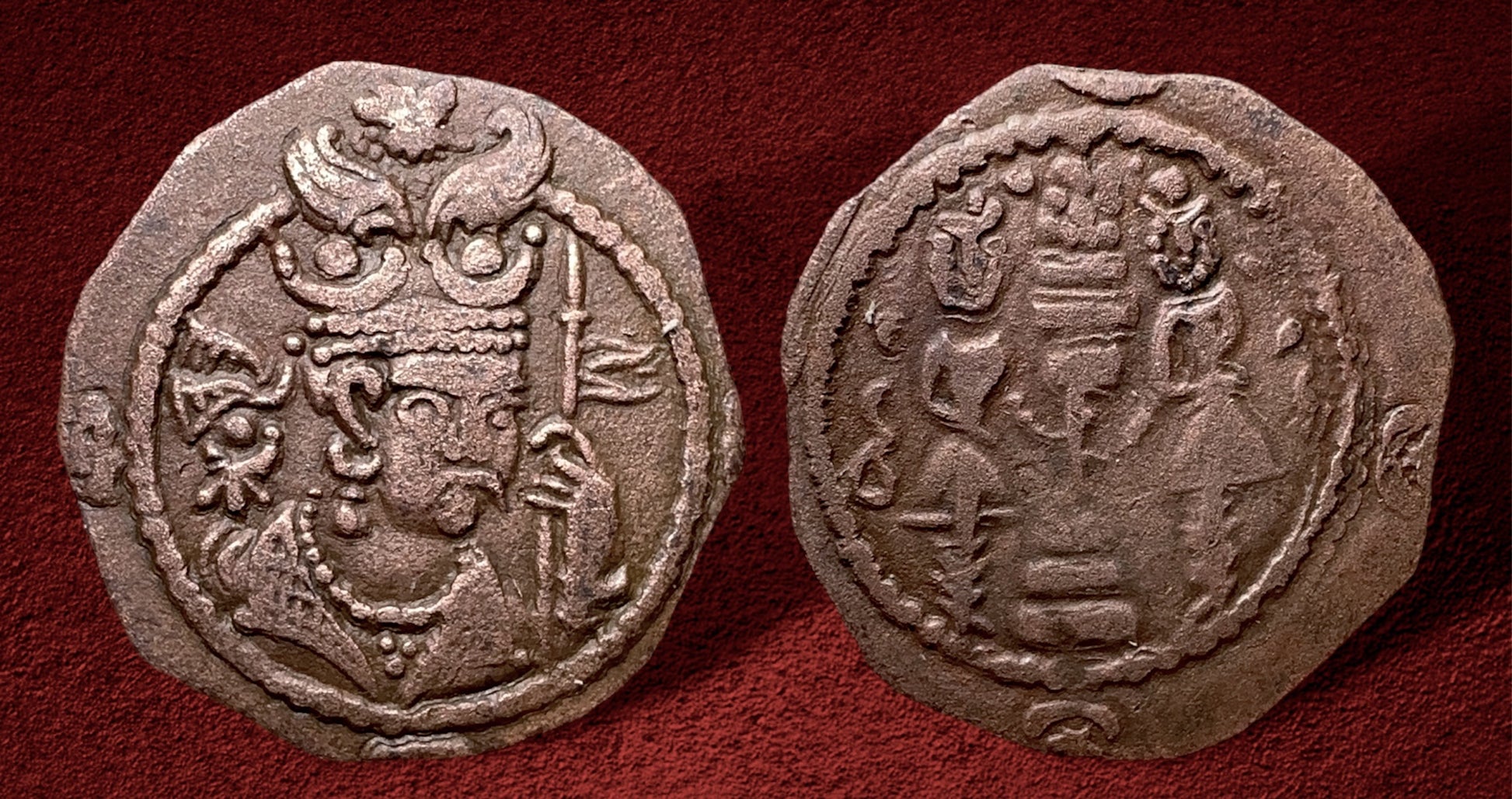Crowned bust facing slightly right (Sasanian style) holding banner tamgha in left field behind / Fire altar with attendants and ribbons. Alram Alchon - Göbl Dokumente Em. 256/3.