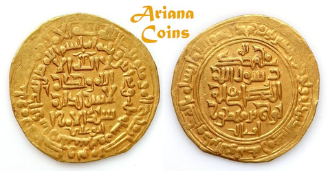 Samanid, Nuh bin Mansur ( نوح بن منصور ‎365-387h), Gold/Dinar. beautiful calligraphy. Rare.