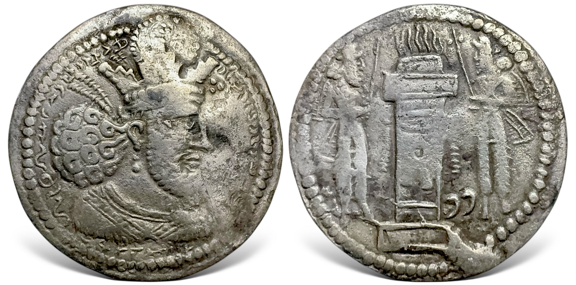 Crowned bust right, crown with crenellations and korymbos / Fire altar with ribbons and attendants, fravahr symbol on altar, "S" in Pahlavi to right.