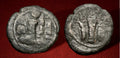 Jugate busts of Varahran (Bahram) wearing winged crown and his queen bust tight wearing 'kolah' with boar’s head vis-a-vis bust of Prince 4 wearing 'kolah' with eagle’s head left / Fire altar flanked by two attendants facing outward each wearing winged crown with korymbos. Zeno 218167. Very fine dark patina Extremely Rare.