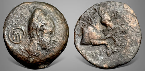 Head of Dioskouros to right, wearing wreathed pilos, monogram behind / Forepart of horned horse to right, [ΒΑΣΙΛΕΩΣ ΣΕΛΕΥΚΟΥ] around, anchor to upper left, monogram to right.